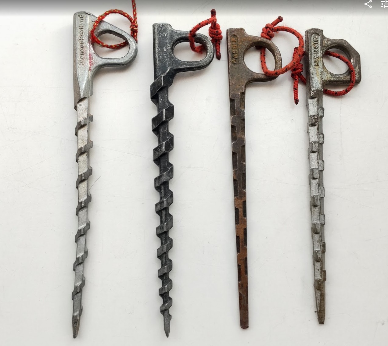 通称イボイボハーケン、つまりワートホッグ、ワーティとか呼ばれるハーケンだが実は使ったことはない。私がアルパインクライミングにのめりこんでいた時期には存在していなかった。当時あったのは平型ハーケン、コの字ハーケン。草付きにはそれらを使っていたが、今あるイボイボほどの確実性はなかったように記憶している。今回メルカリで探してみるとメーカーはサレワ、カシン、モチヅキ、glencoe Scotlandと四種類四本とバラエティに富んだ出品だ。しかし、重量は125~140gとかなり重い。四本も腰にぶら下げたら1kgになってしまう。