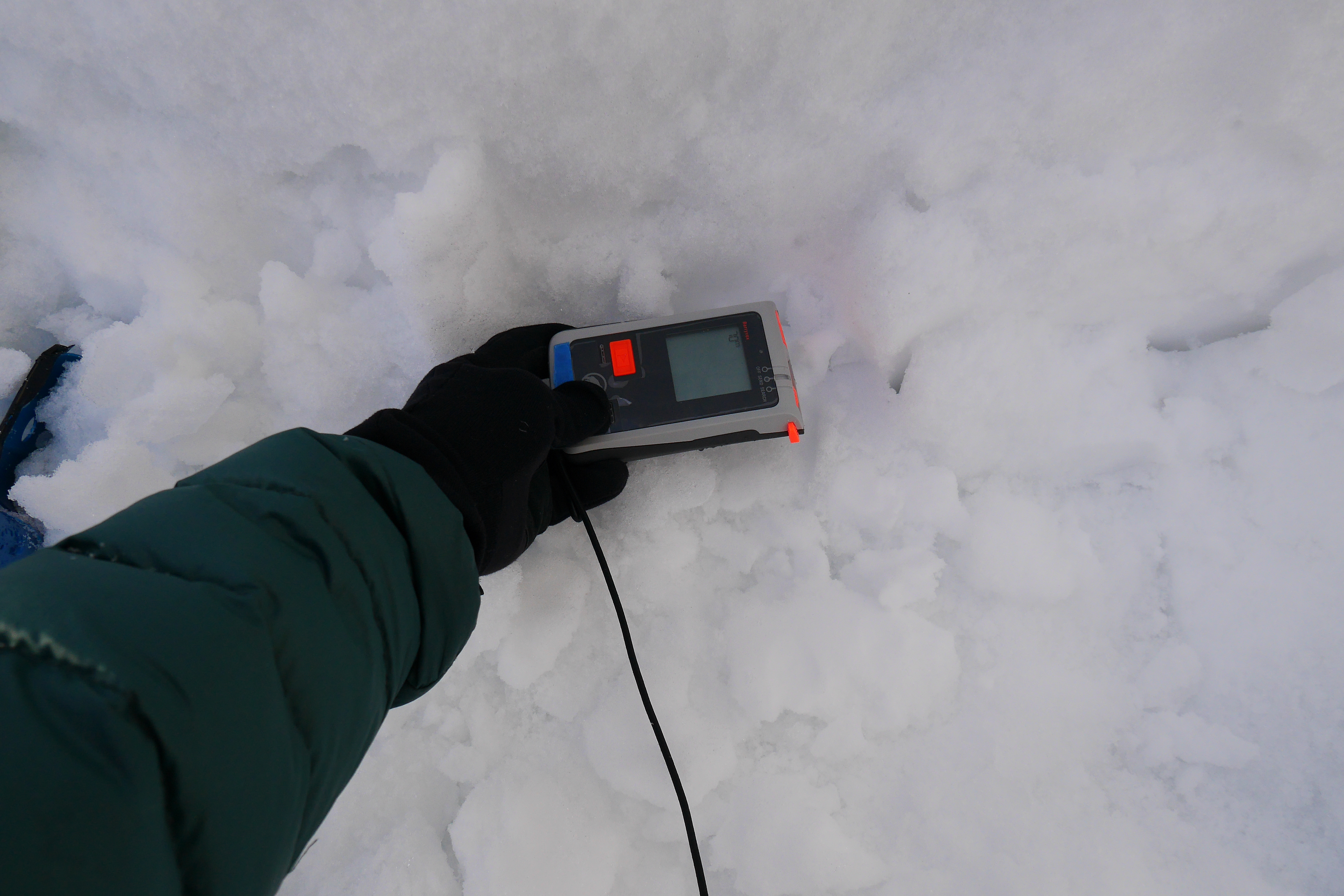 当日の積雪は深く、2.5mのプローブでも地面に届かなかった。もし当たらない場合、雪面を30cm程度掘り下げる。