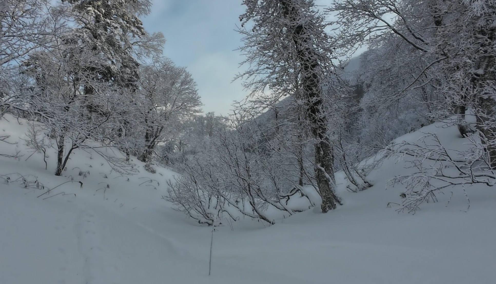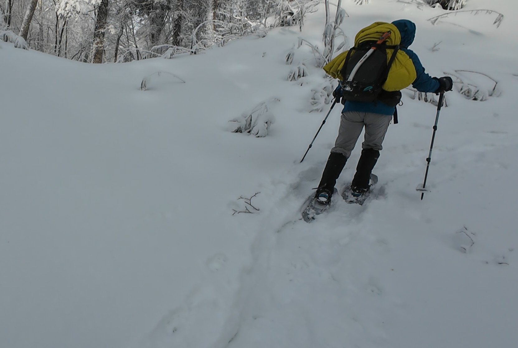 ともあれ、天気は良いので7:43駐車場を出発。風もないのに寒い。暖かい日々が続いていたから余計に寒さを感じるのだろう。30分程度で登山口。体を動かしているのに汗を全くかかない。トレースはわずかにあるが意外に沈まない。もっとも、ほとんどTKさんがラッセルしている。積雪は想像していた通り少ないが、意外にブッシュは邪魔にならず歩きやすい。とはいえ、寒さは堪える。