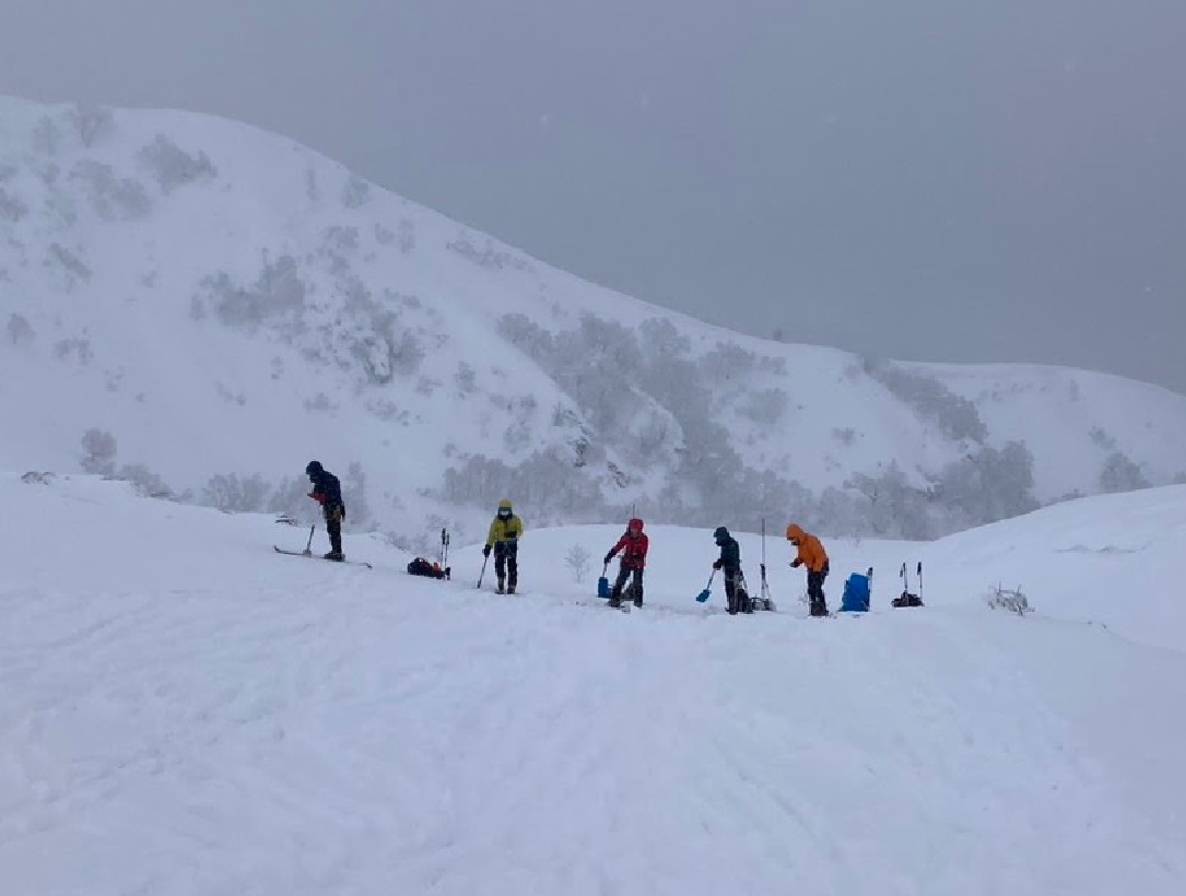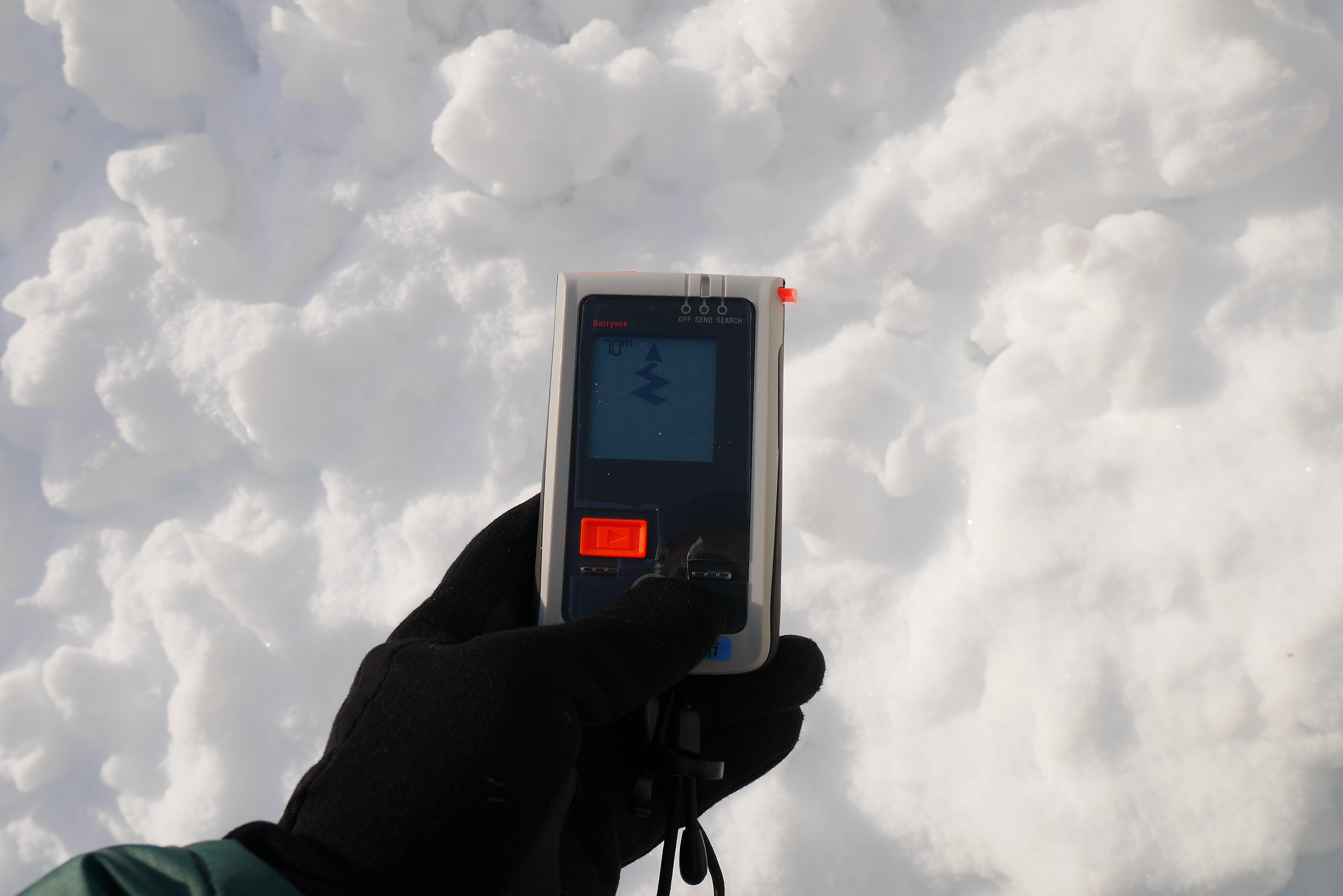 複数名が埋没した場合のサーチは複雑になり、注意が必要だ。埋没者の1名が特定されたらマークする。直ちにマークされていない埋没者へとサーチは誘導されるのだが、この日はマークしているにもかかわらずサーチは二方向を示して少し混乱した。最初の埋没者を掘り起こし、ビーコンのスイッチを切ると混乱は解消し、次の埋没者を特定救出した。