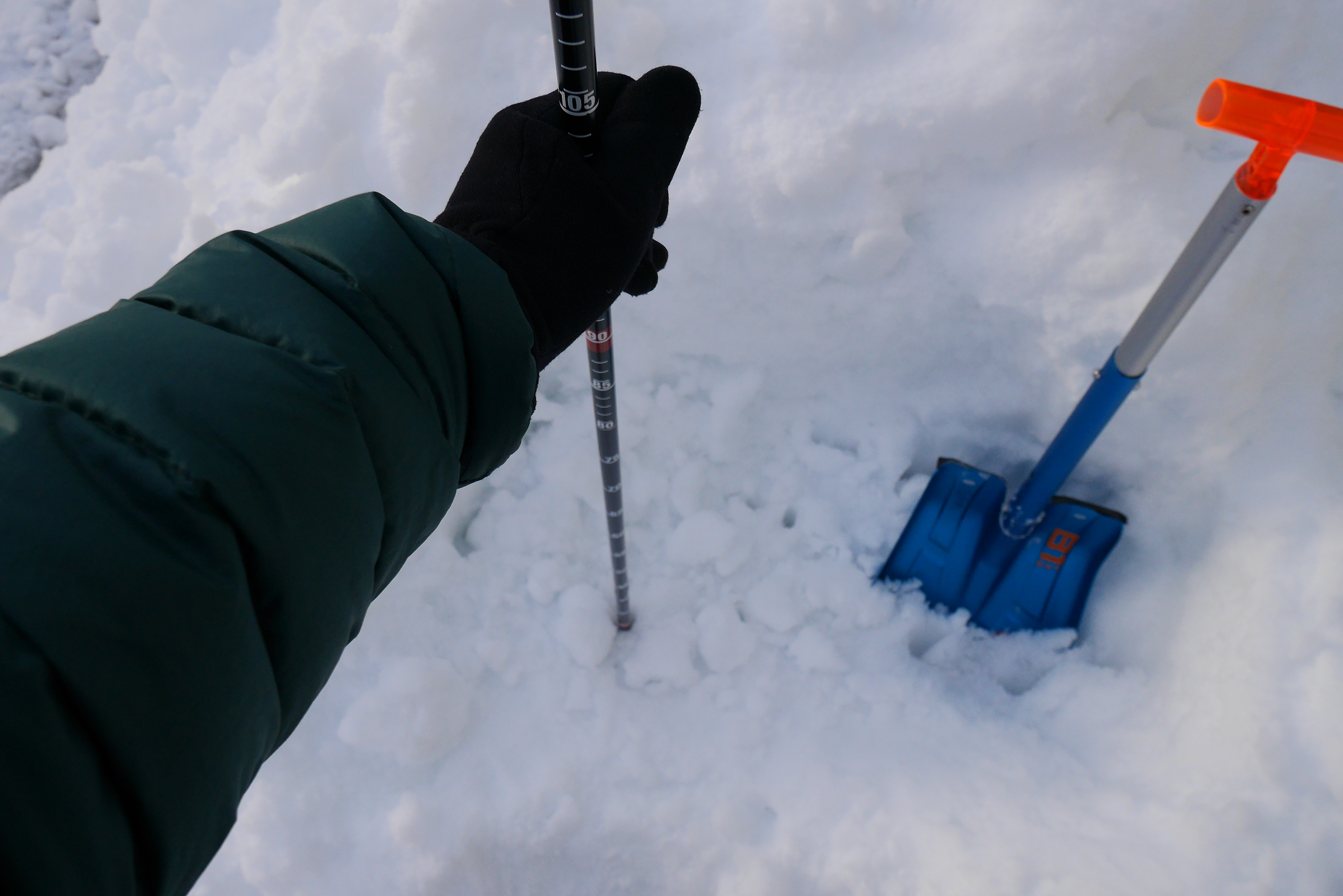 当日の積雪は深く、2.5mのプローブでも地面に届かなかった。もし当たらない場合、雪面を30cm程度掘り下げる。