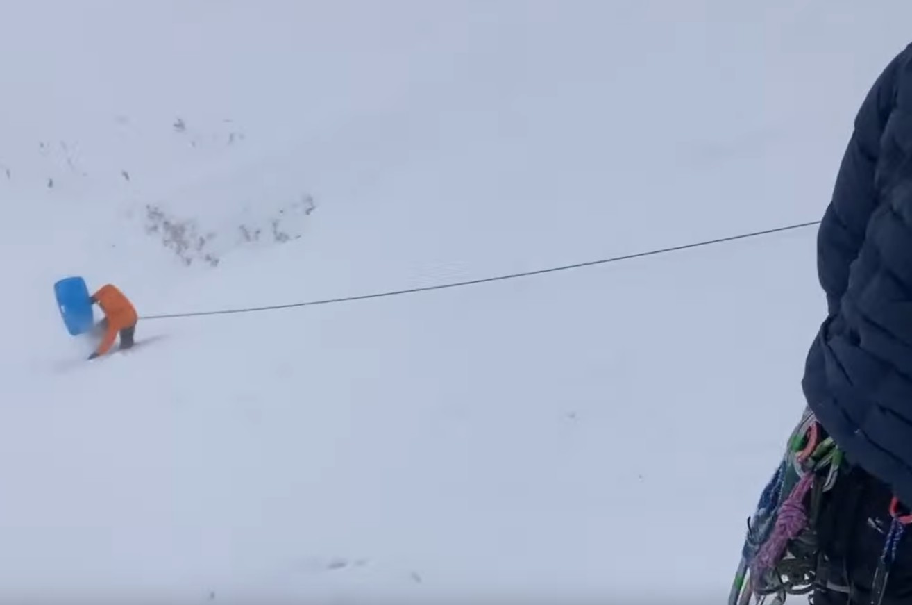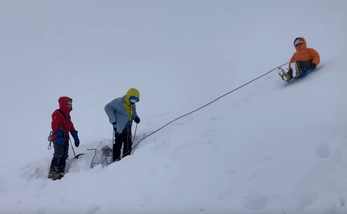 ビレイする相手が落ちた場合(訓練では7~8m上からソリを使い斜面を落下)相手を確認し、ショックが来る瞬間にロープを1秒くらい流し、制動手で確実に握りしめ止める。いわゆる流動確保なのだが、落ちた瞬間に両手を硬く握りしめがちになる。