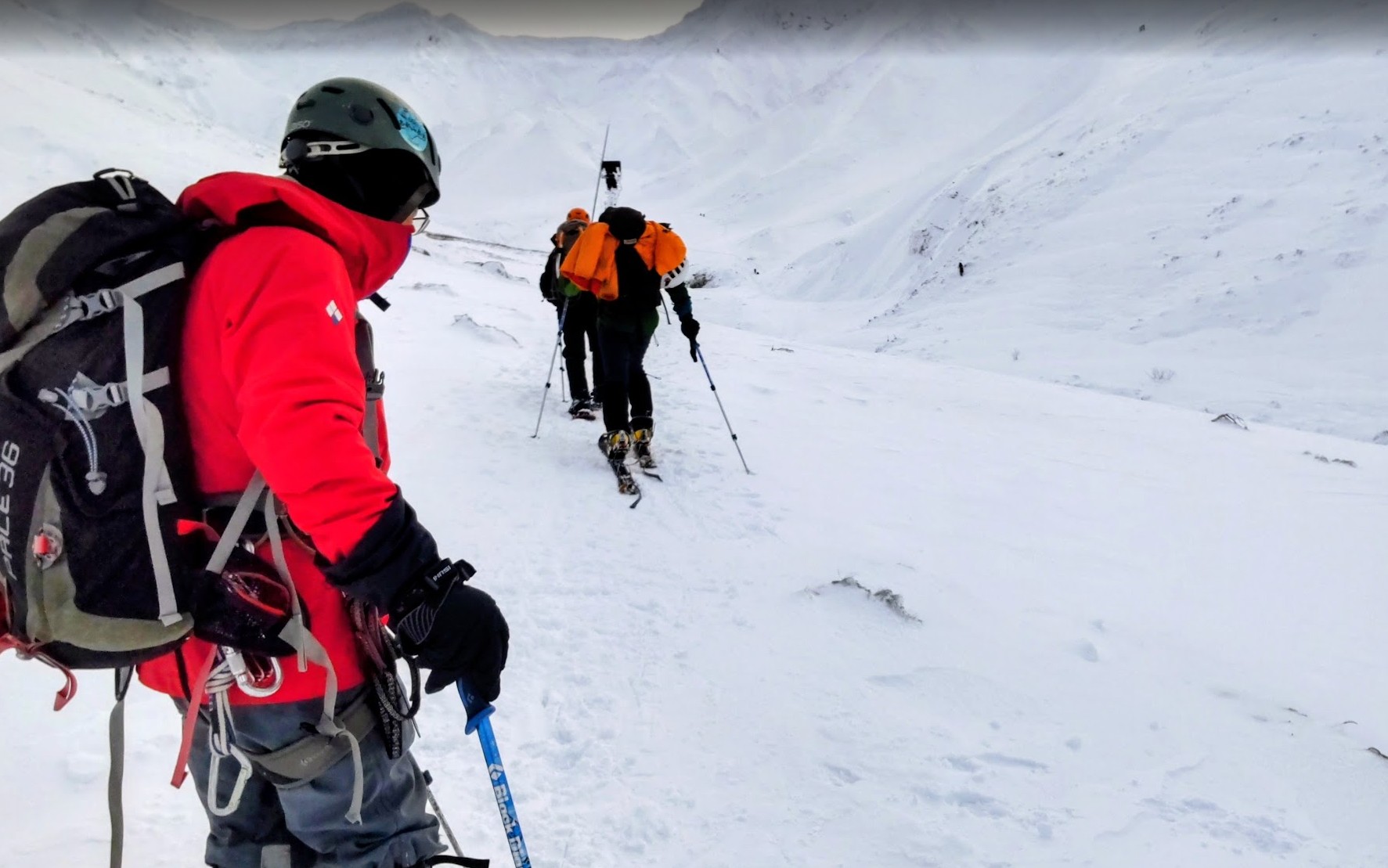 7:30 スキーが4人、スノーシューが2人で出発。昨年同時期にくらべて雪は多く感じる。出発してまもなくビーコンのグループチェックを行う。問題はなし。安政火口でアイゼンに履き替え三段山方向の斜面に向かい、スタンディングアックスビレイの適地を探す。