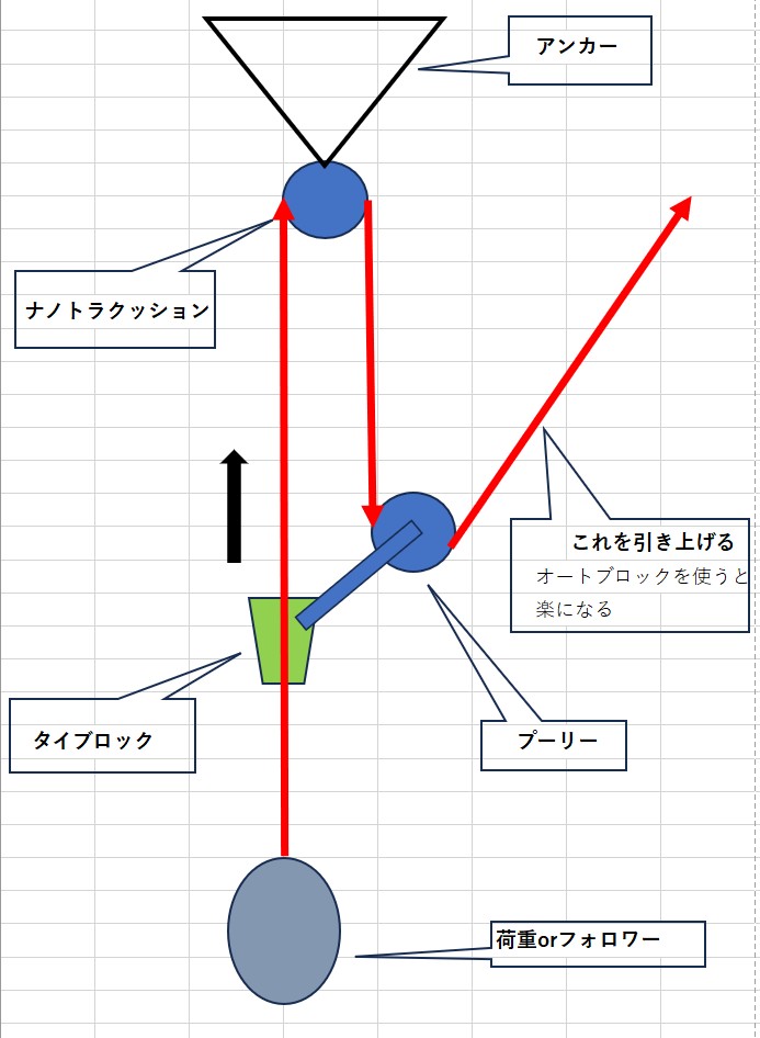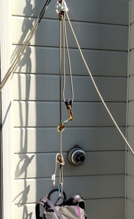 過去にアルパインクライミングで何度か荷揚げをやったことがあり、プーリーとカラビナ、ユマールを使った。多分1/3システムだったと思うが、なかなか苦労した記憶がある。