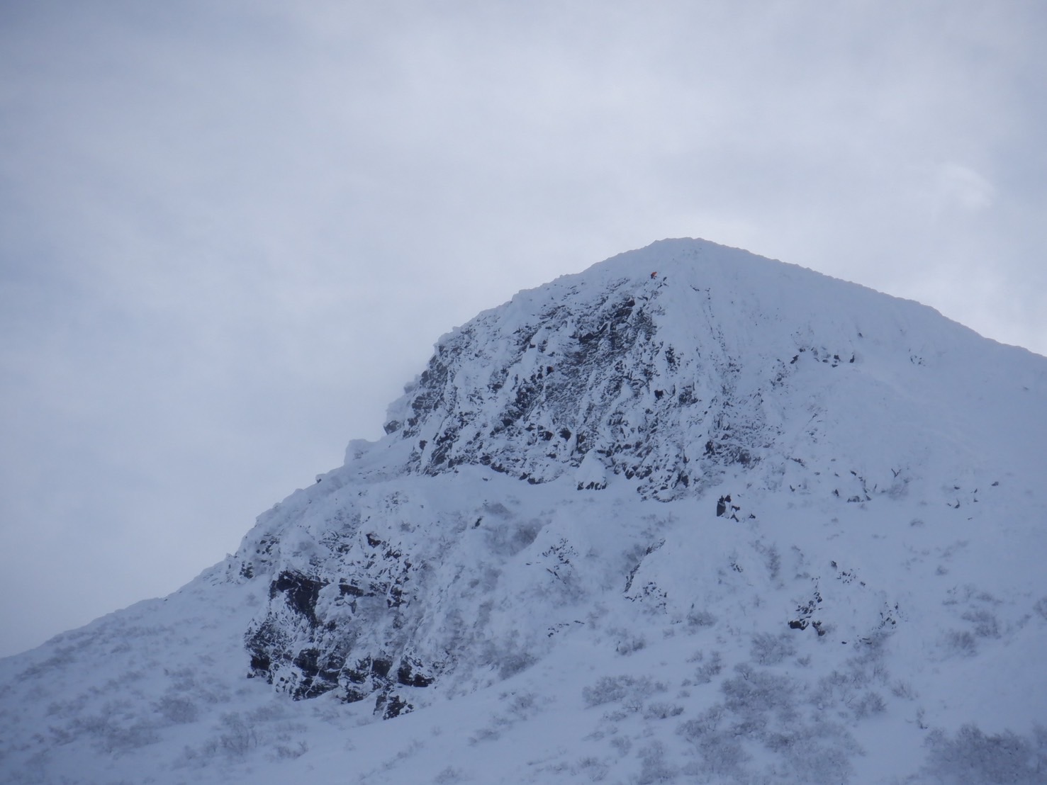 各クラブの訓練が今週も行われるため20台ほどの車がある。今回は初日にクライミングを行い、次の日訓練の予定。アプローチはスノーシューの私を除きスキーなので、どうしても遅れがちになった。9:20旧噴デポ地点到着。北西綾へ向かう三人と別れ、スノーシューとスキー、ストックをデポし真上の化物岩へ向う。天候は良いとは言えなく、化物岩がようやく全体が見え、八つ手岩は霞んでいる。正面壁は全く見えない。カリカリの場所とハイマツで抜けてしまう場所があり、なかなかきつい。30分程度で左ルート取付きに到着した。ハイマツでアンカーを作りビレイ。旧噴デポ地点では問題なかった風が、ここまで来るとかなり強い。大昔、あまりの強い風にⅮ尾根を這って降りた経験が脳裏に浮かんだ。
