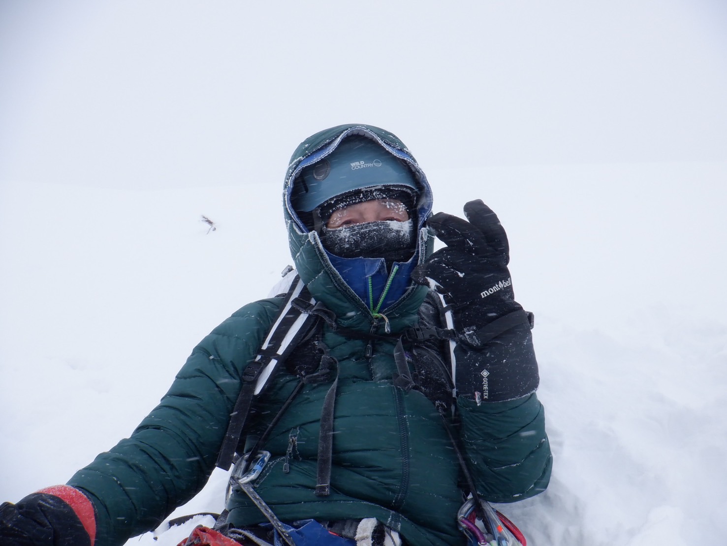 中段の雪田は、北西の風がまともに吹いているので、まつ毛が凍りつき視界が狭い。凍傷を避けるため左に顔を向けざるを得ない。厳冬期のカミホロでは、風速は時速20~30メートル程度になることがある。風はさらに強くなり体感気温はマイナス35℃を楽に超えているだろう。油断すると一発で凍傷だ。グローブはmont-bellのインナー付きにしたので安心だが、時々指先を確認。上から下まで保温に気を使った装備であるが、ビレイで待つ間時々震えが来るほど寒い。ときどき体を動かす。3P目はカラカラの岩ではなく土が凍りつき、アックスが気持ち良いくらい決まるので快適だ。ルンゼを真っ直ぐに登ると傾斜が緩み、アンカーでビレイしているリーダーが見えた。視界は悪くホワイトアウト寸前であるが、不思議なことに化物岩ピークの風は下段ほど強くない。